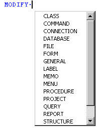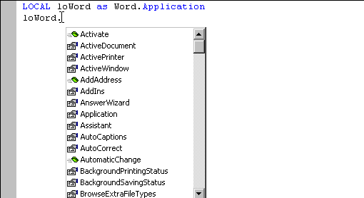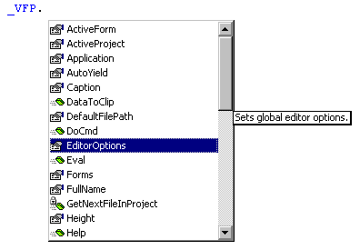 List Members: Specifying an object, such as _VFP, and pressing the dot will bring up a list of members of that object. VFP's Intellisense will also do this with existing (instantiated) live objects while developing, but it is also smart enough to pop up these lists in code windows when the objects are strongly typed. See Figure 4, Figure 5, and Figure 6 respectively.