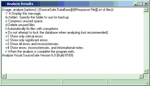Analyze is an essential utility for analyzing the health of a VSS databases, detecting inconsistencies and errors, repairing some of the more simple errors, and compacting unused space in the database. ANALYZE should be run periodically (at least weekly) on production databases. The results of Analyze can be a little difficult to decipher, but the Administrator help file (and also Microsoft KnowledgeBase article Q152807) list the more common errors and documents fixes, where available, for these errors. After making a backup of the database and attempting to fix it, always run Analyze again to verify that the problem has been fixed, and to find out if fixing this error brought forth any other errors the first problem may have been masking. In many cases, the Analyze, Backup, Fix cycle may need to be run several times.